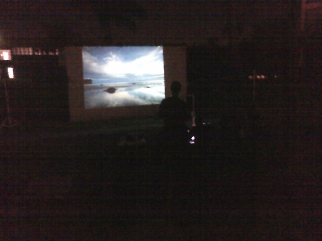 WALK-IN MOVIE NIGHT — 8pm tonight we had a different kind of movie night for our last evening together before the weeklong “Mid-Semester Break.” We laid out on the grass & watched “Norbit” projected onto a wall outside. — Great idea! Need more OFF!