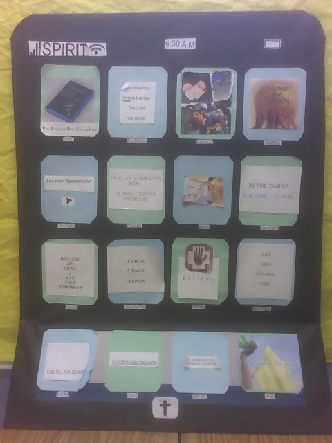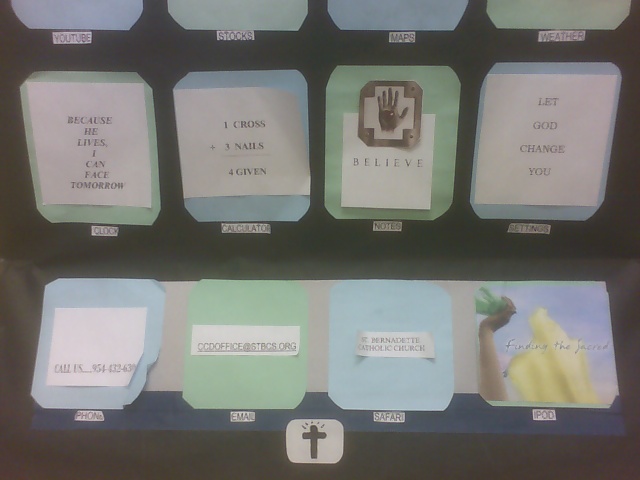 Since we were so close to my home parish of St Bernadette in Hollywood, FL, I stopped in to see the high school RCIT class preparing for Confirmation this year @ 4pm. I saw this cool poster that one of the catechists made and had to take some pictures. It’s a poster of an Apple IPhone, but with Christian buttons. — Some great details