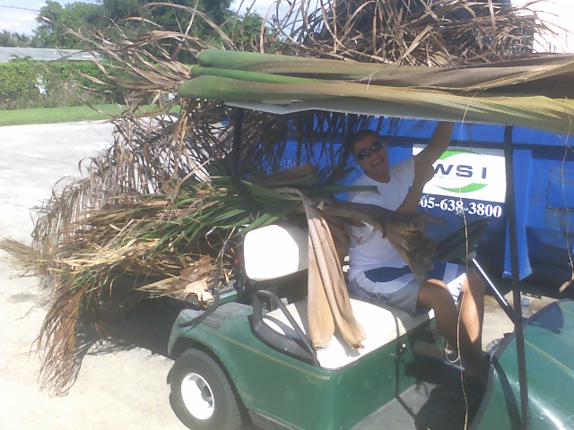 WORKLIST (manual labor) — Cool weather was nice. Busy day today with lots of palm branches to pick up. Also found some proud weed-pullers. I also caught my golf-cart partner Manuel swinging from a palm branch like a makak (Creole for “monkey”). — Holy labor!
