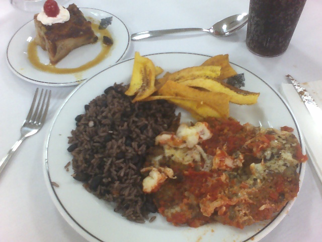 Tonight’s CULTURAL FOOD NIGHT featured Cuban food, which I helped (un pocito) with after classes. Chicken & rice (secret ingredient = Corona), plantains (chips & cooked). — Great eatin’ / delicioso!