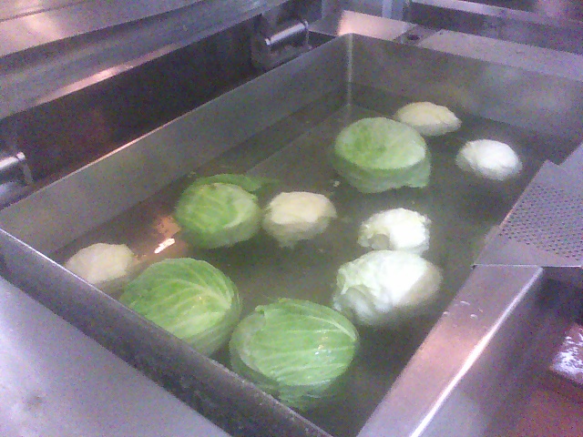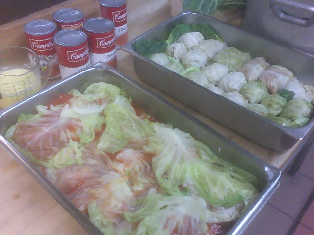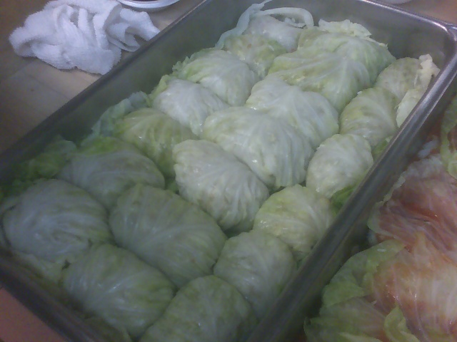 Yesterday, we made the potato and cheese fillings, but spent most of the time working on the gołąbki (stuffed cabbage rolls). Gołąbki is a hearty traditional Polish dish consisting of boiled cabbage leaves stuffed with ground beef, chopped onions, and rice or barley, baked in a spicy tomato sauce; similar to a Cabbage roll. By the time we stopped on Monday, we only had 1.3 pans full of them (we needed 3).