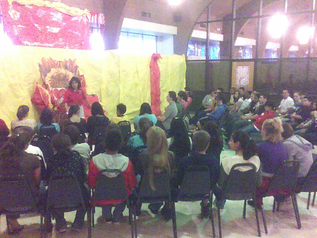 Back at my home parish, the 8th grade Confirmation kids (some were my CCD kids from last year) had an evening of reflection as a follow-up to their 2-day Confirmation Retreat last month [my previous blog post about it]. The schedule was pretty simple. After 6pm Mass (which I served at), pizza on the deck, a great skit (see pictures) about Jesus bridging the gap in the face of temptations, a personal witness talk by a teen, small group debrief (“What’s happened since the Retreat?”), and some large group reflections (that I couldn’t stay for) to close. The kids definitely wanted to be there. A great sign of their Confirmation journey.