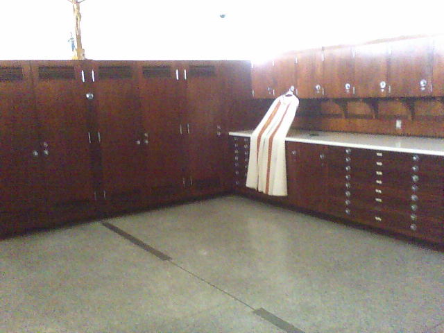 WORKLIST — in “Sacristy,” I had bathrooms, so I finished pretty quick with time enough to help mop. The tapistry of St Lawrence (hurricane damaged) was also being put up, so I took some pictures up close.